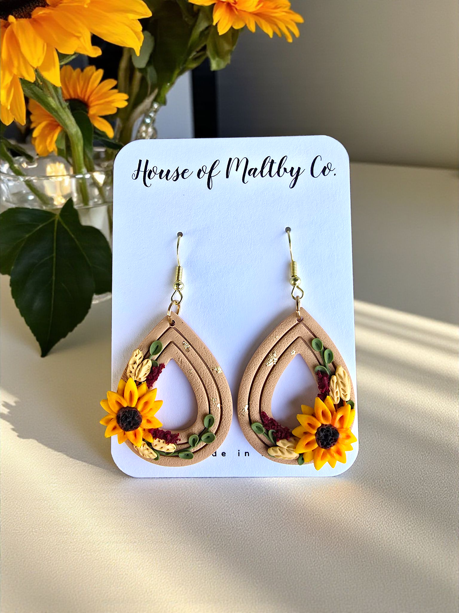 Get festive for fall with these unique taupe teardrop polymer clay earrings featuring accents of wheat, astilbe, and vines, with a beautiful sunflower as the focal point. Metal pieces are gold. The packaging states that the metal pieces are nickel-free.