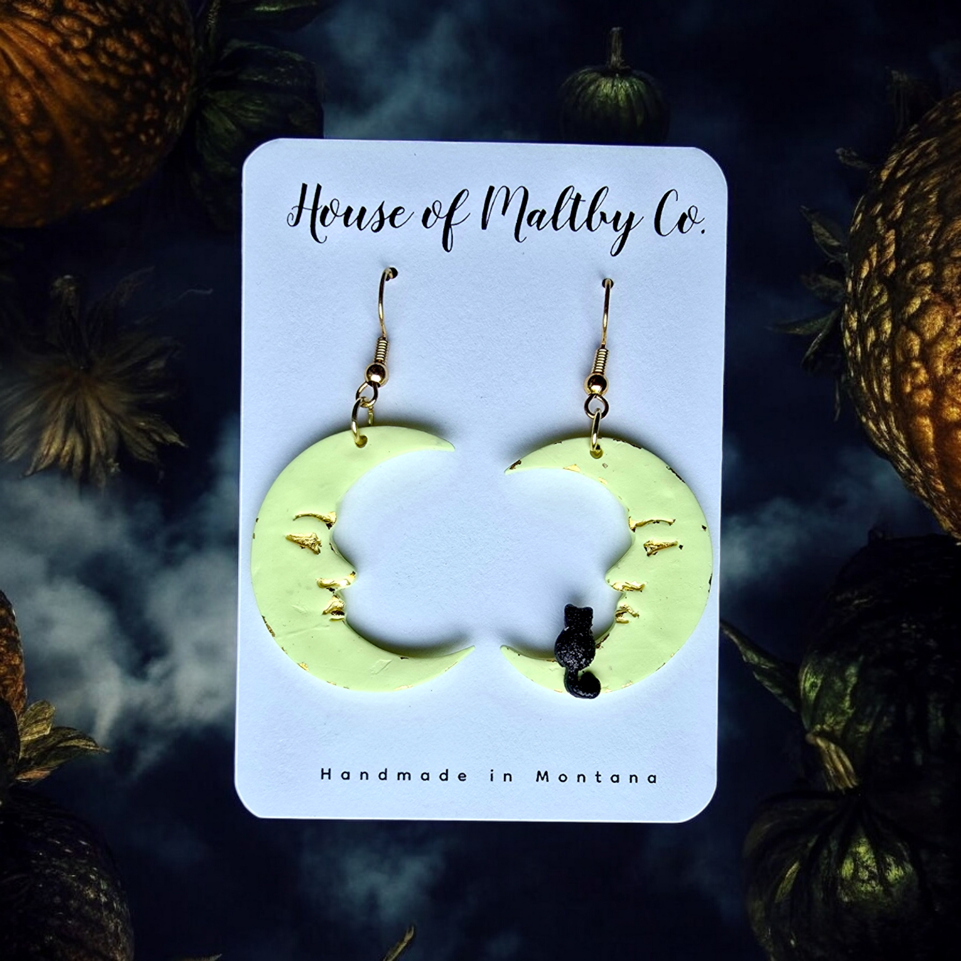 They are made with polymer clay, with a gold foil inlay to show details of the moons face and the cat is covered in black glitter.