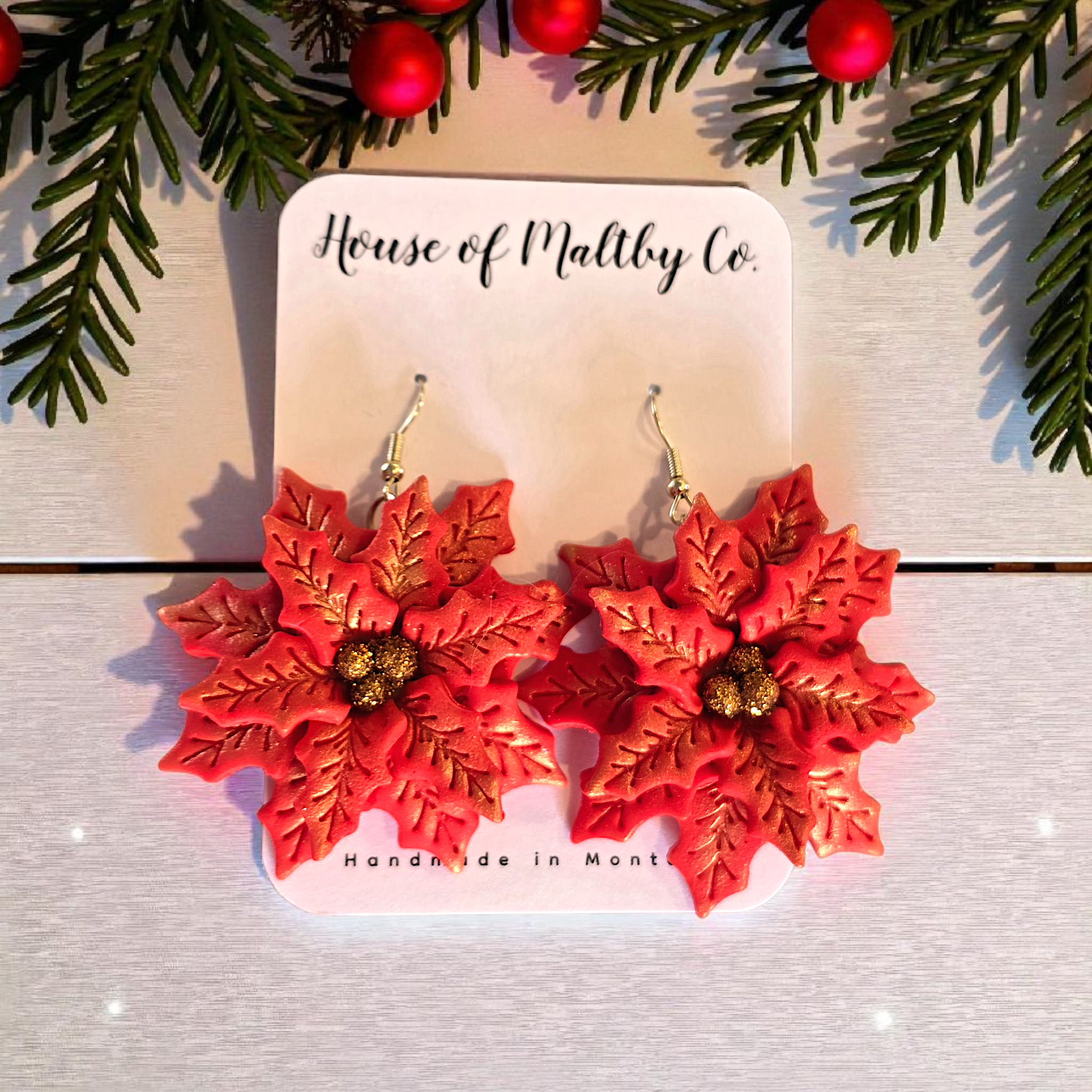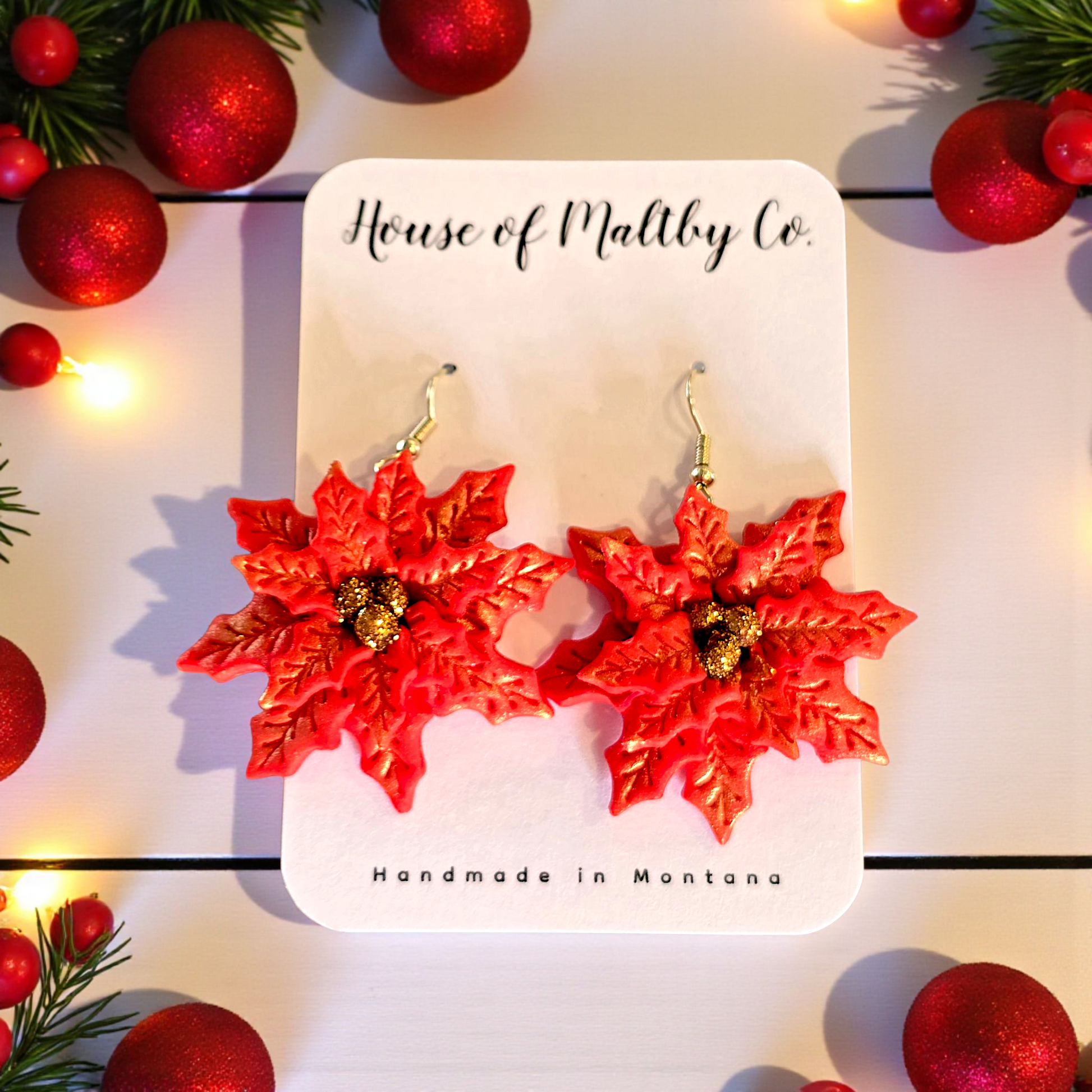 Add festive elegance to your holiday look with these handcrafted red poinsettia polymer clay earrings, shaped petal by petal for a beautifully detailed seasonal design. Each vibrant red petal is accented with gold metallic detailing, giving the flowers a warm, luminous shimmer perfect for Christmas time.