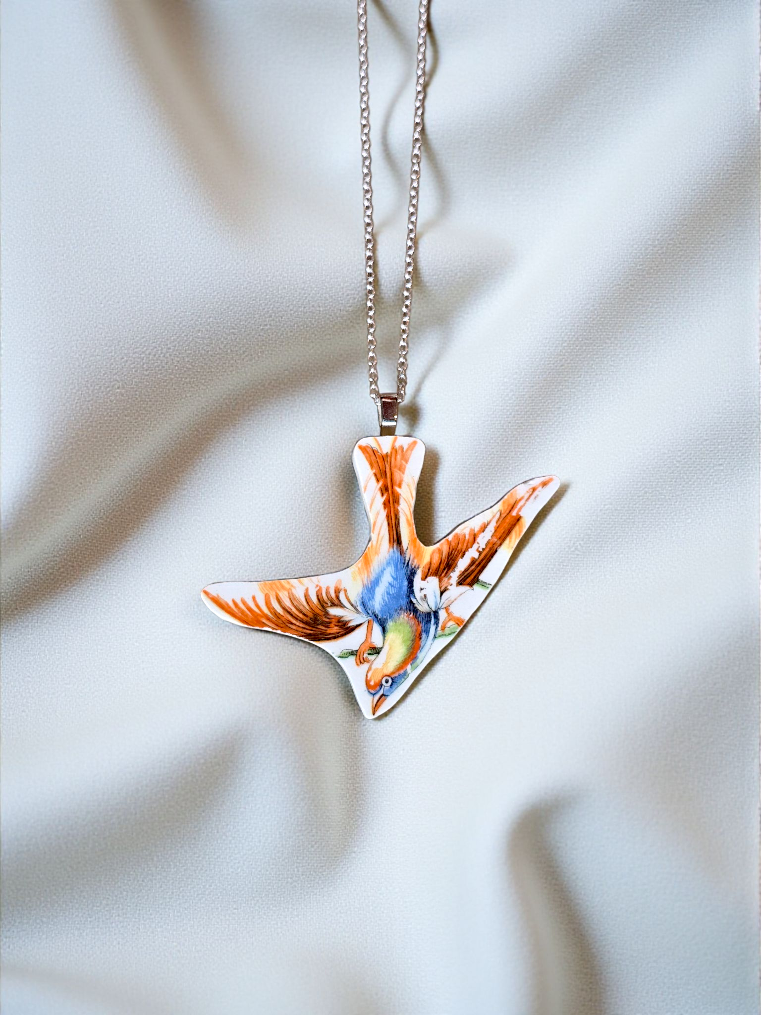 The porcelain edges are left raw for an authentic, organic look, then carefully sealed with a clay varnish to ensure durability while preserving the character of the original plate. Suspended on an 18-inch chain, this pendant brings a graceful touch to any outfit and makes a memorable gift for bird lovers and collectors alike.