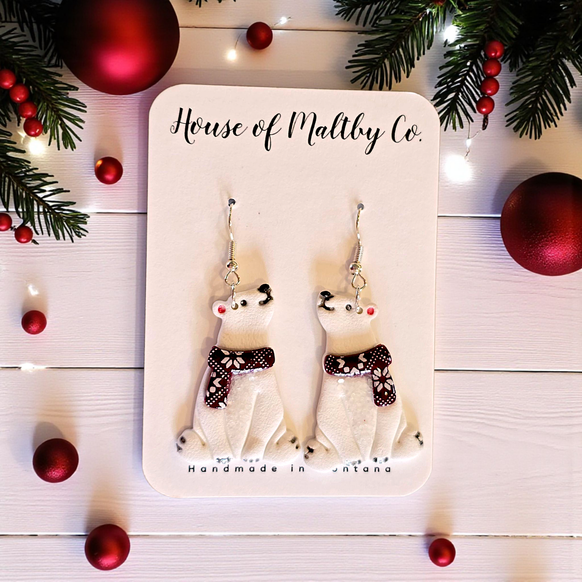 These charming polymer clay earrings feature adorable polar bears bundled up in cozy dark red winter scarves, each accented with a delicate hint of sparkle for a festive touch. Each bear has soft detailing that brings out its sweet, gentle expression, while the textured scarves add a pop of rich seasonal color.